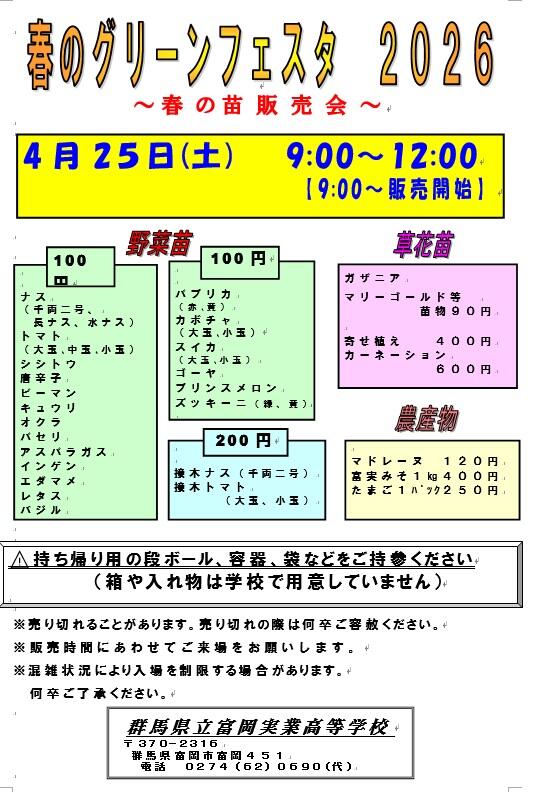 4/25(土) 9:00~12:00まで野菜苗等の農産物販売会を富岡実業高等学校で実施します。このグリーンフェスタでは生物生産科の生徒を中心に栽培した野菜苗(2万鉢)と、カーネーションやラベンダーなどの草花、鶏卵、マドレーヌや味噌の販売を行います。